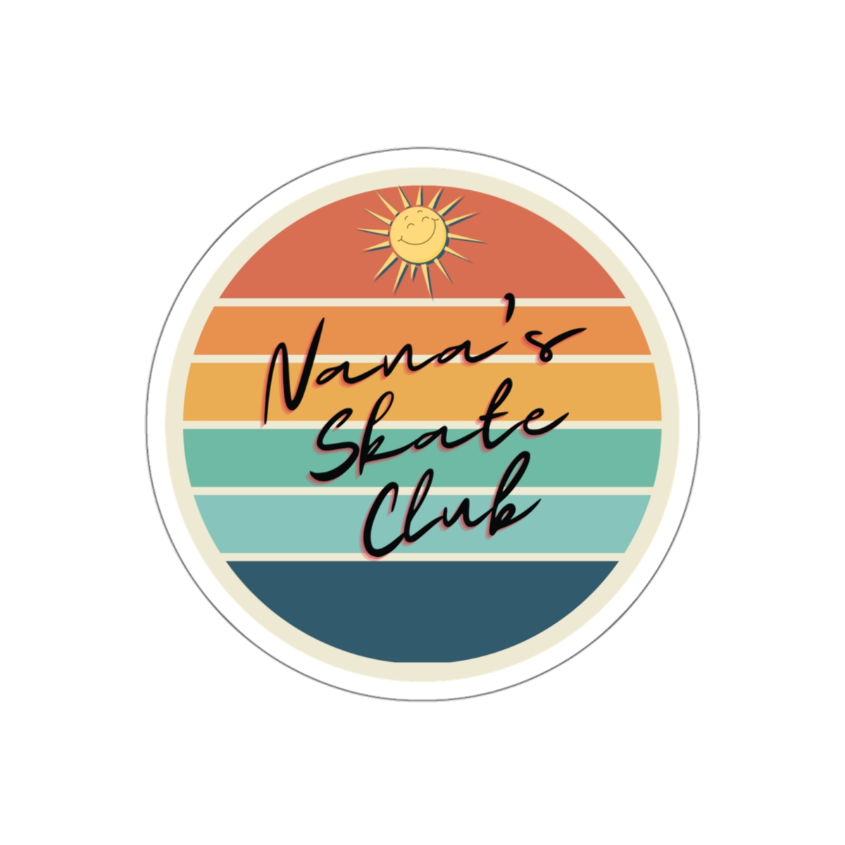 Introducing our vibrant and playful “Nana’s Skate Club” round sticker! It comes in two sizes. Whether you’re an avid skater or simply adore the rollerskating culture, this sticker is a must-have addition to your collection. Crafted with a die-cut design for easy application, this sticker features a captivating colorful striped circle background that instantly grabs attention.